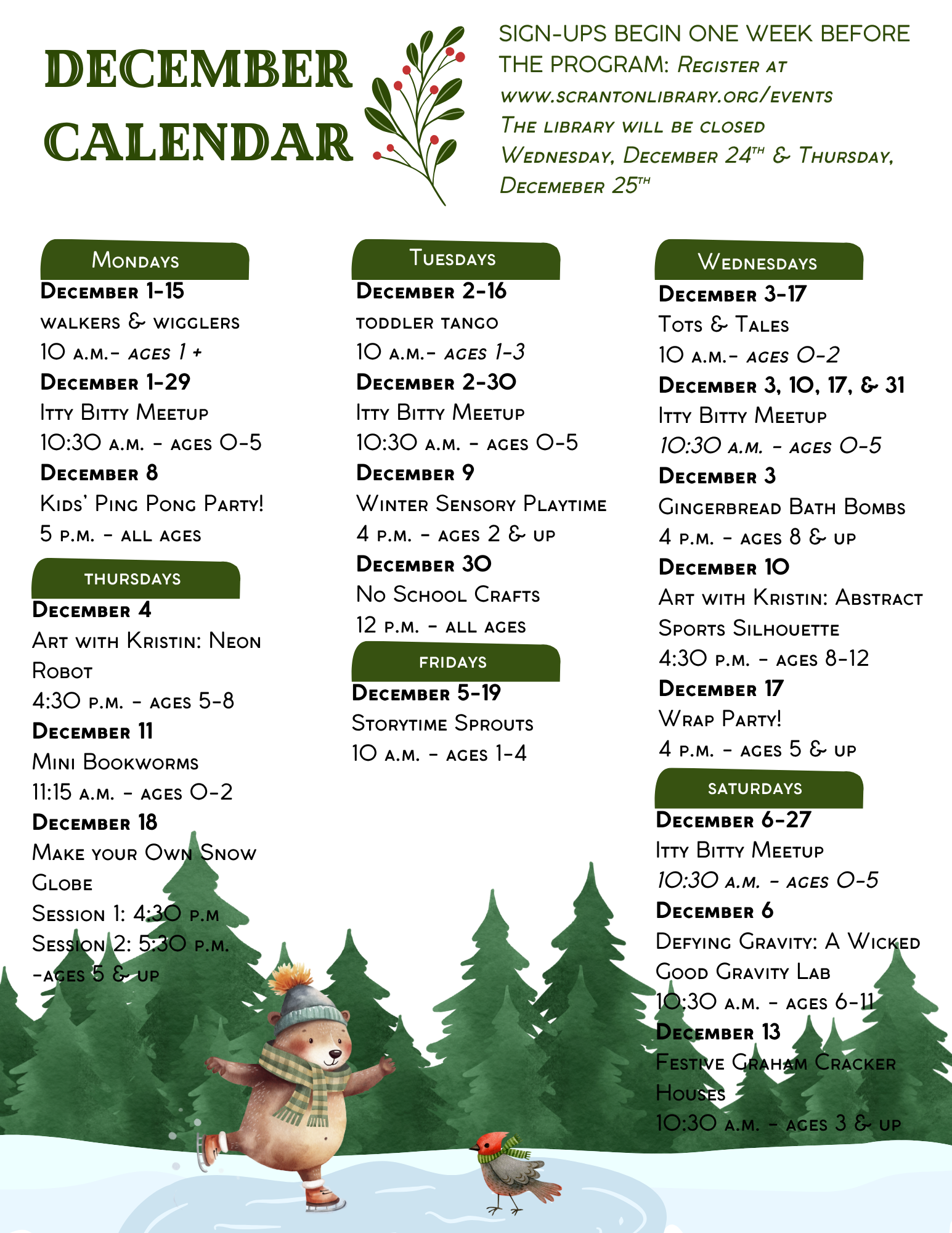 Our librarians are always here to help answer your questions! Call us at 203-245-8722 during our open hours, or email childrens@scrantonlibrary.org at any time.