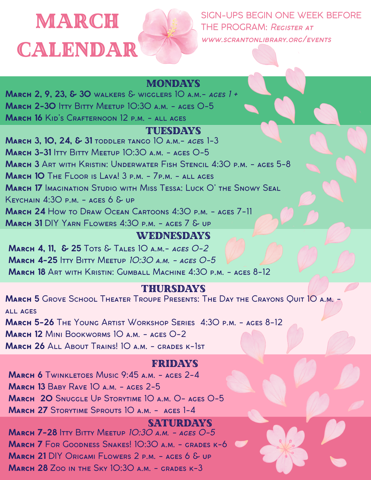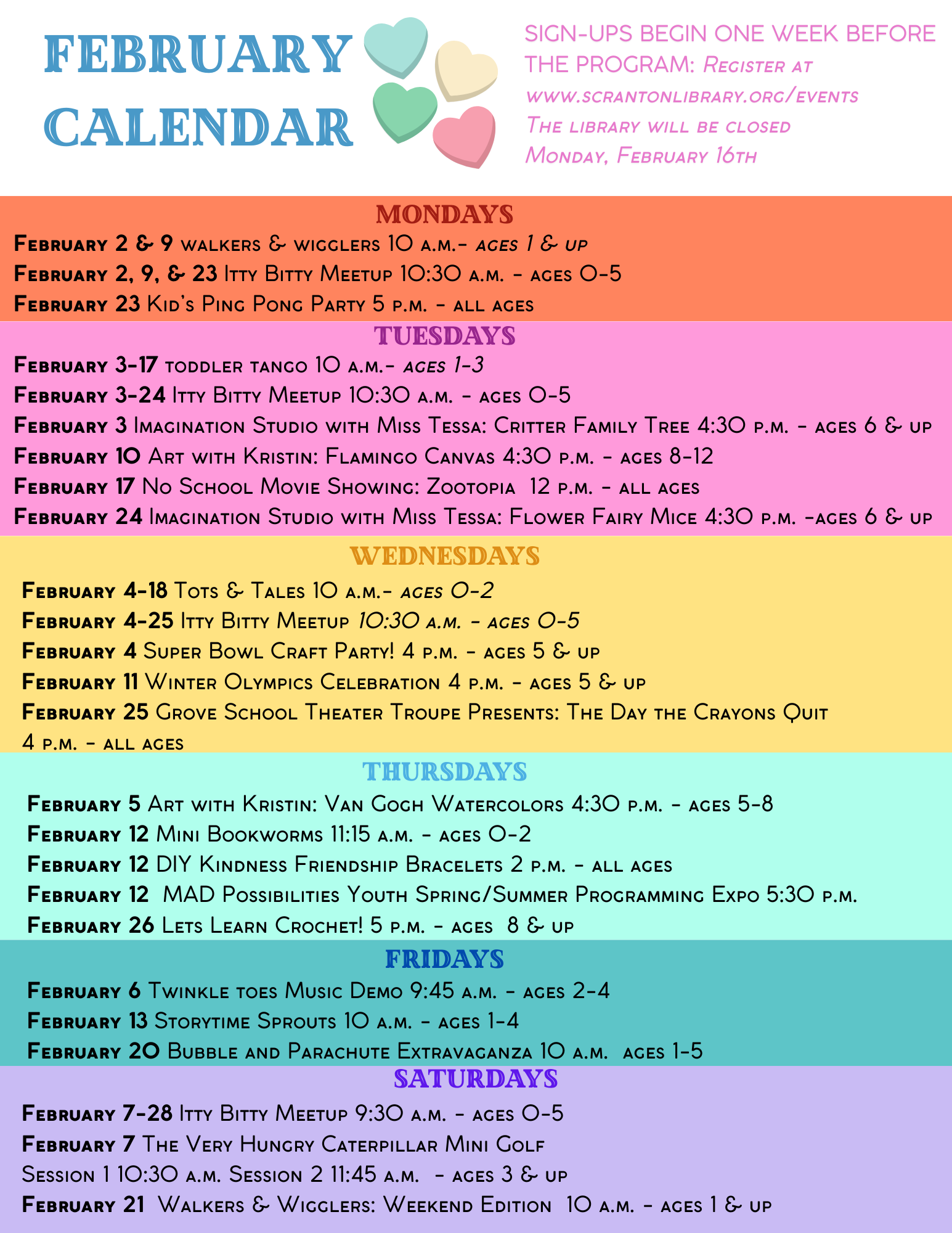 We offer weekly story times for babies, toddlers, and preschoolers, as well as weekly art and STEM programs for grade schoolers. We also host a variety of fun one-time events, including music programs, crafts, outdoor activities, and more! Register here for upcoming events.